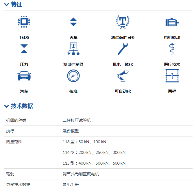 该试验机系列是TestT的单机机。113 型适用于高达 50 kN 和 100 kN 的测量范围。TestT 114 型号设计用于测量 200 kN 至 400 kN 之间的范围最终值。负载框架的设计使其可以用作校准机。TestT 115 型号的测量范围高达 500 kN 和 600 kN。